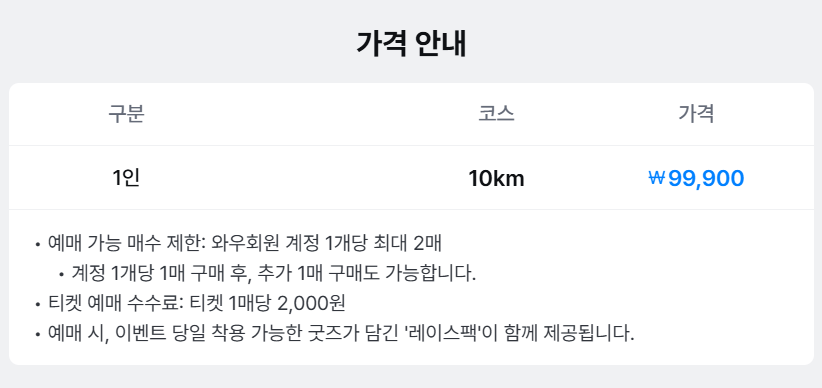 - 출발 그룹 배정 : 티켓 예매 시 제출한 10km 마라톤 완주 목표 기록에 따라 그룹 배정. 미제출 시 임의 배정.