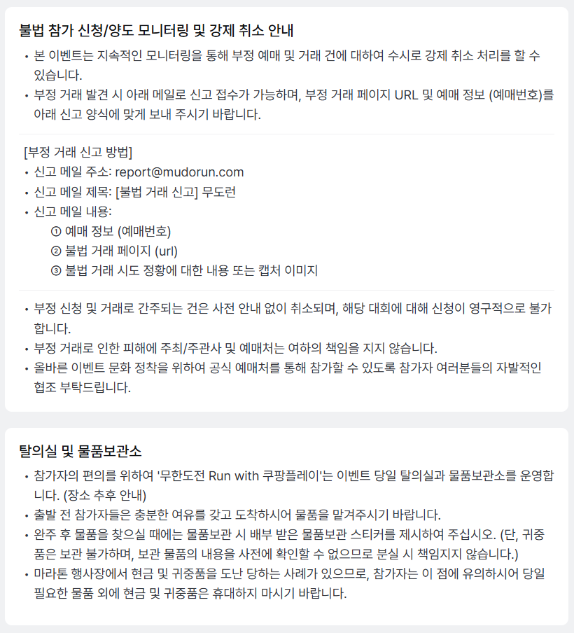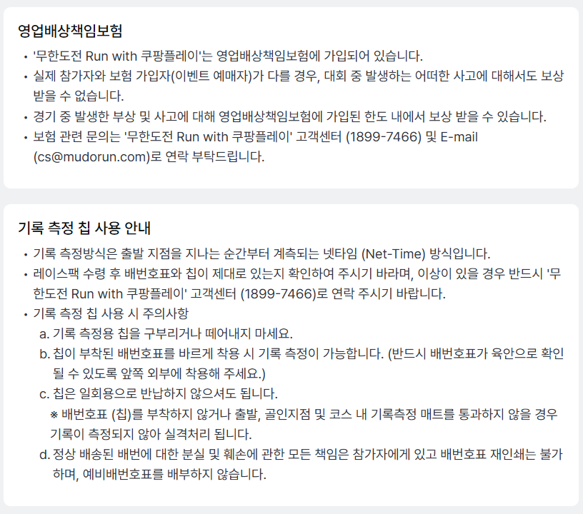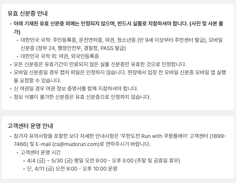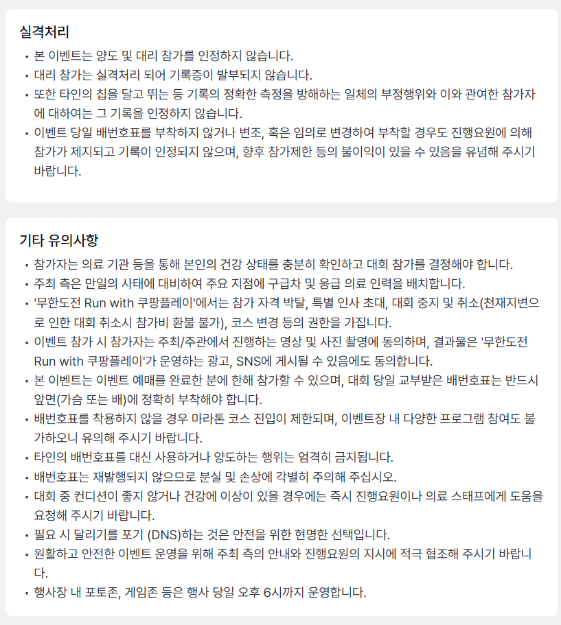 - 본인 확인 : 이벤트 당일 현장에서 유효 신분증과 마라톤 참가 배번호표를 통한 본인 인증 진행. 배번호표 양도 불가.