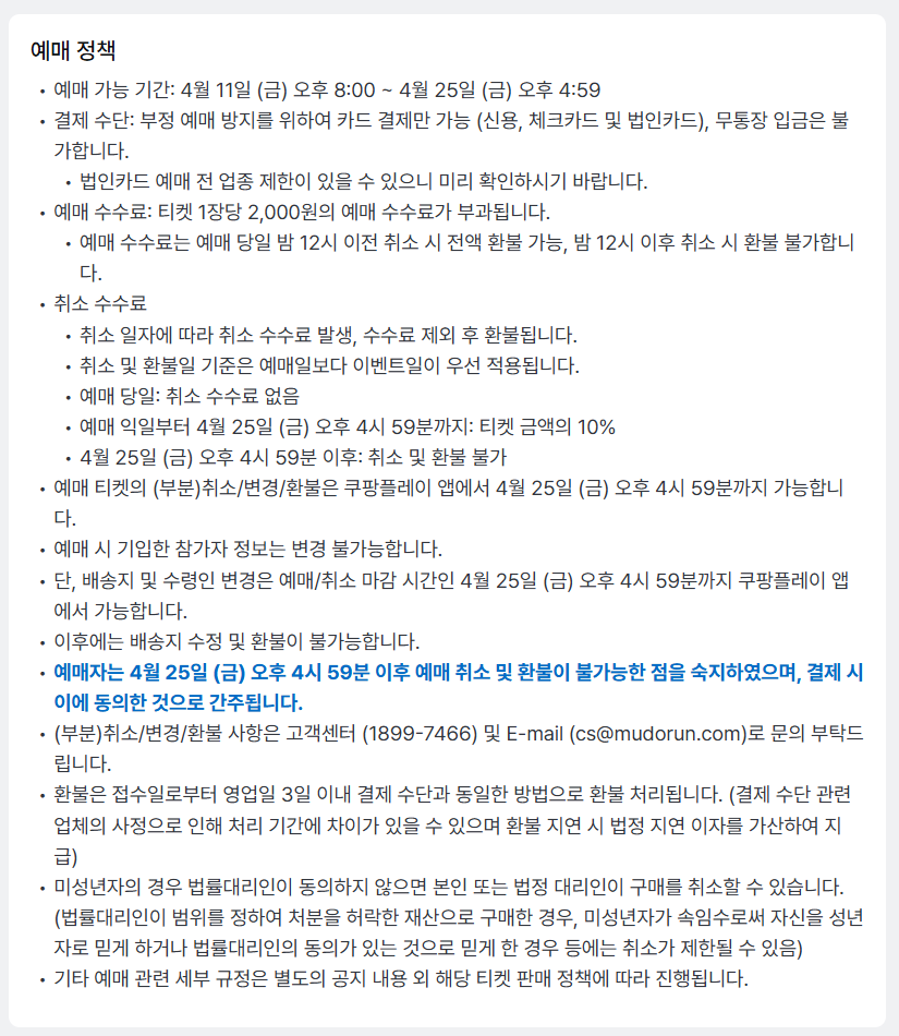 - 예매 일시 : 2025년 4월 11일 (금) 오후 8시부터